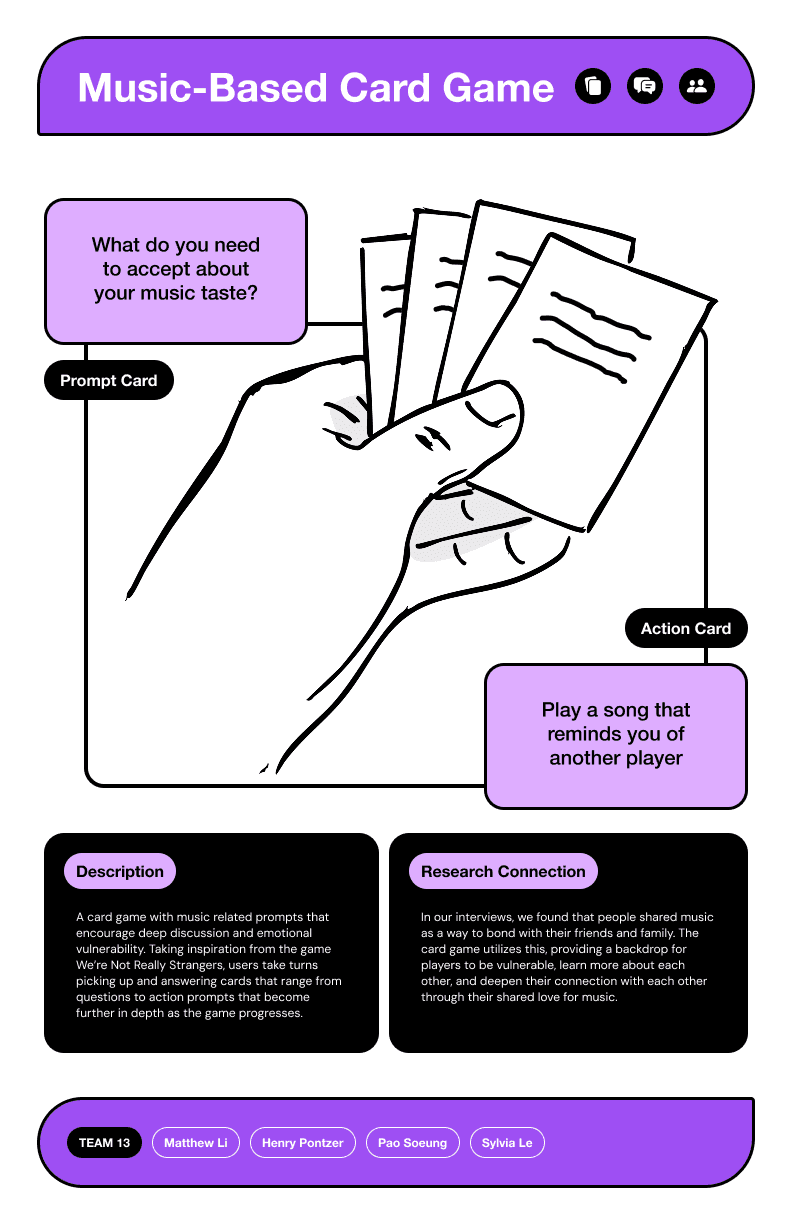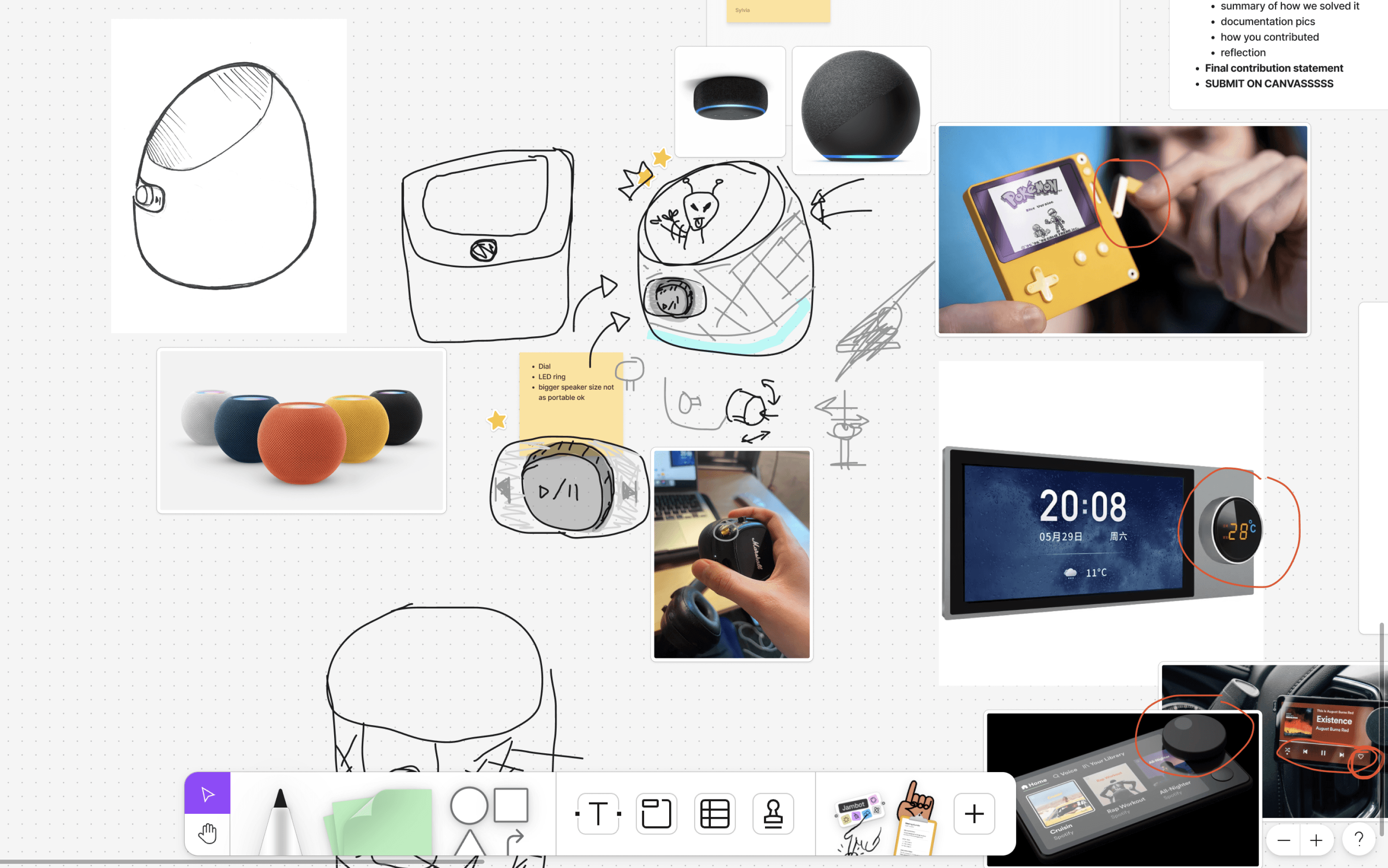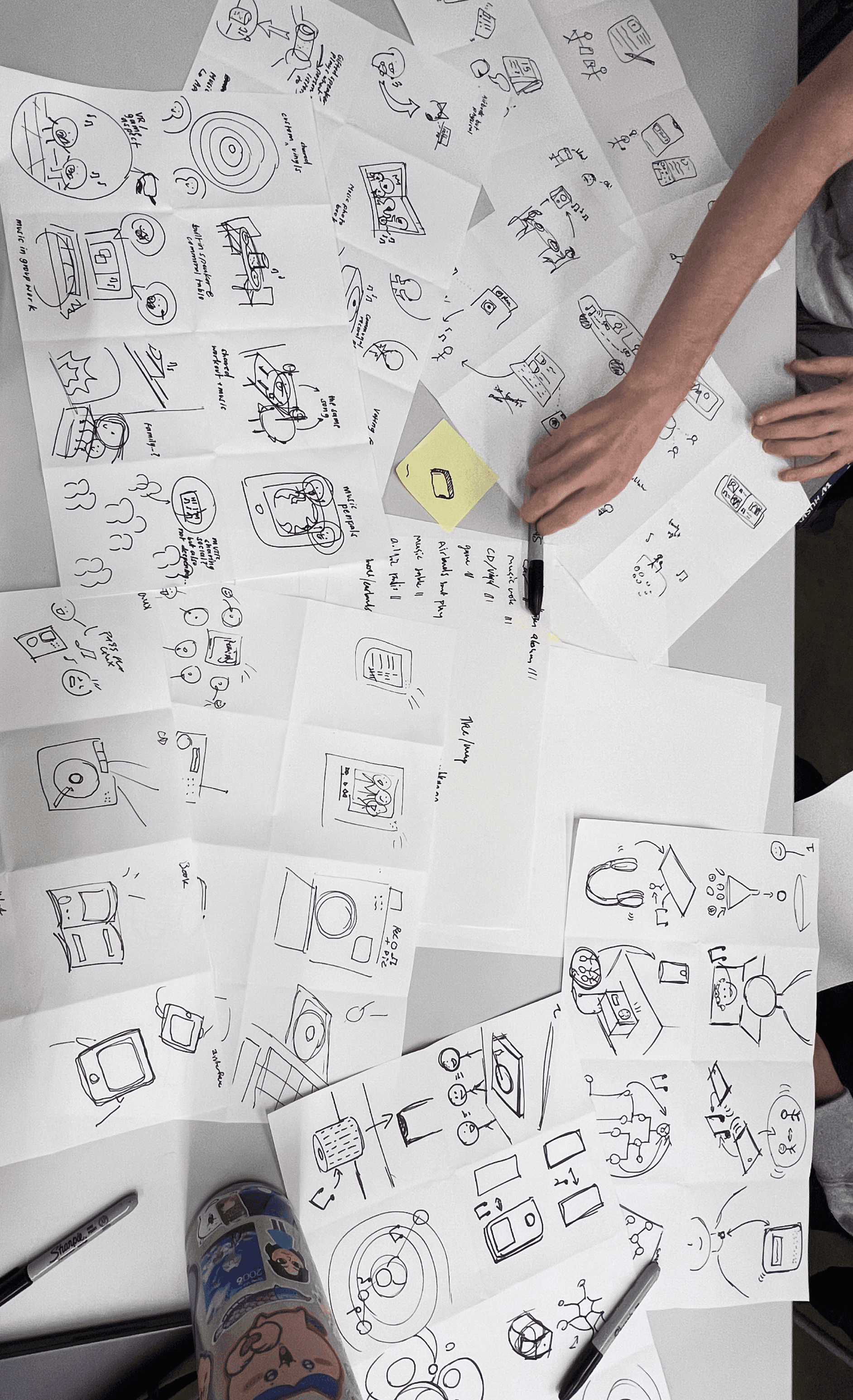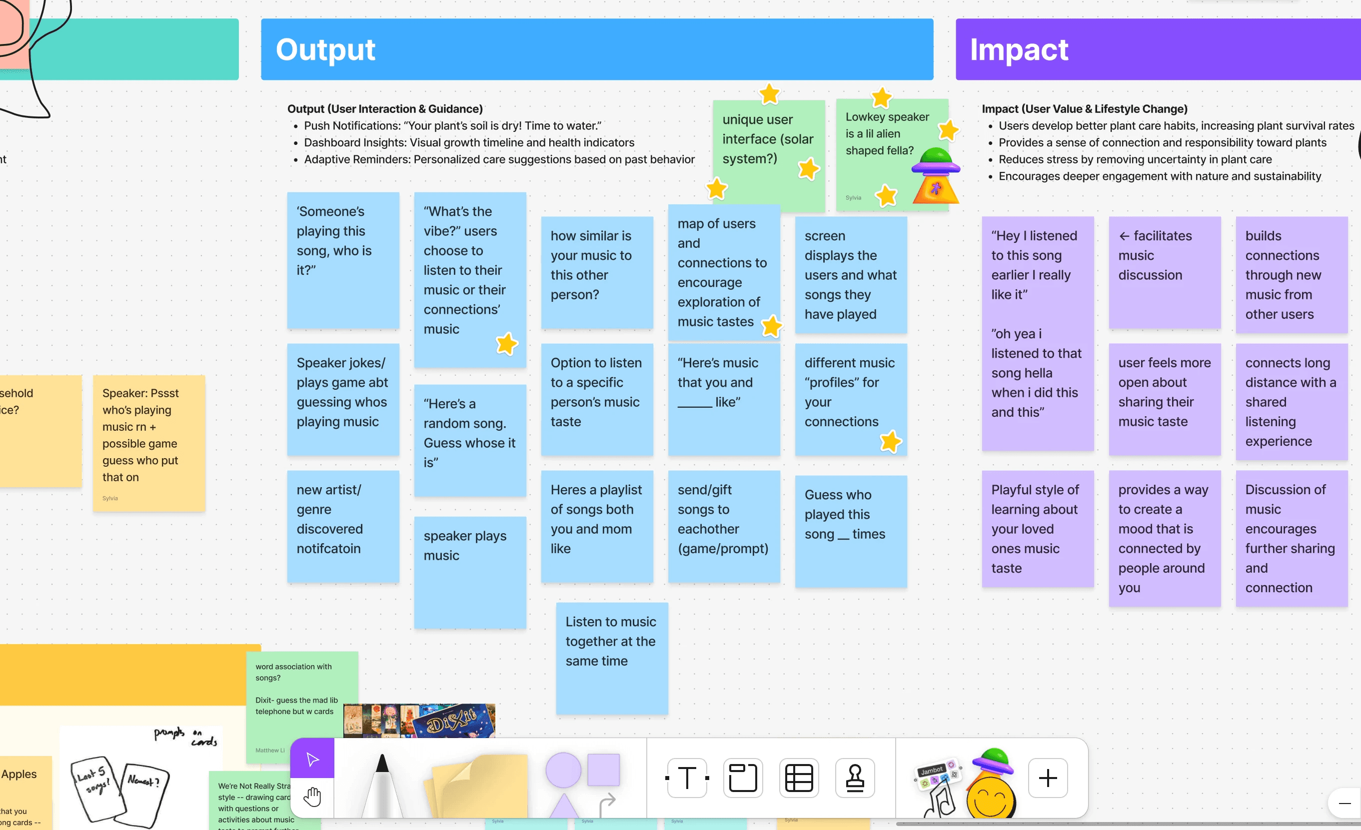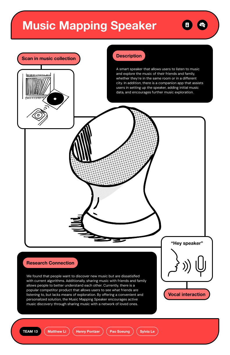We ended up with roughly 60 ideas and later narrowed it down to the most distinct three that aligned most with our How Might We Statement. The final idea we decided to continue with was the music mapping speaker because it had the most possibilities for its features and outcomes. It also was the one we felt most passionate about.