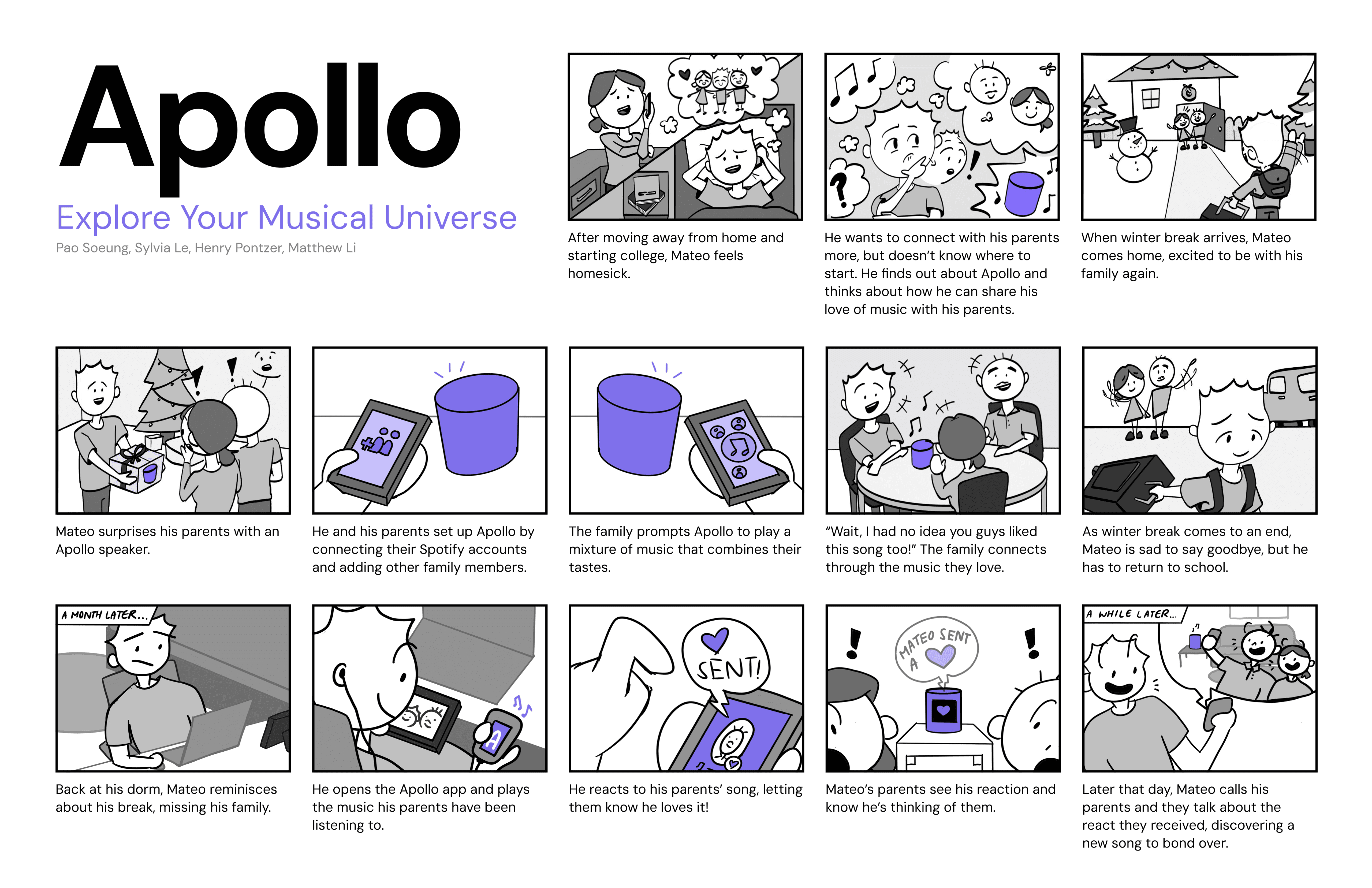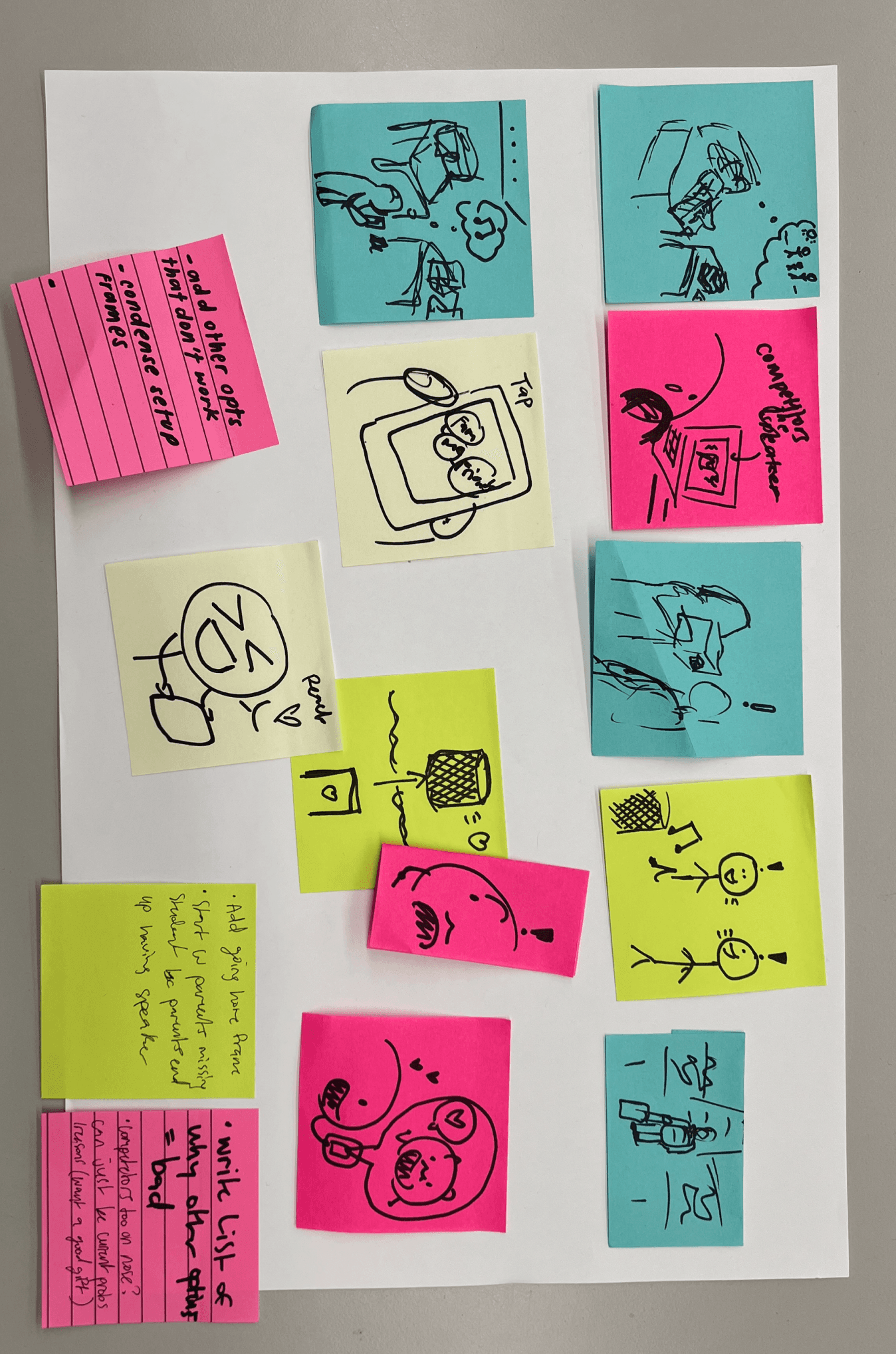We used storyboarding to show the impact of our solution. First, we wrote out the general plot, then had each person draw a version of the storyboard. This was followed by a show and tell to choose and combine the frames that best conveyed the scene. From there, we did several rounds of feedback to finalize the story. Then, Pao and I illustrated it digitally.