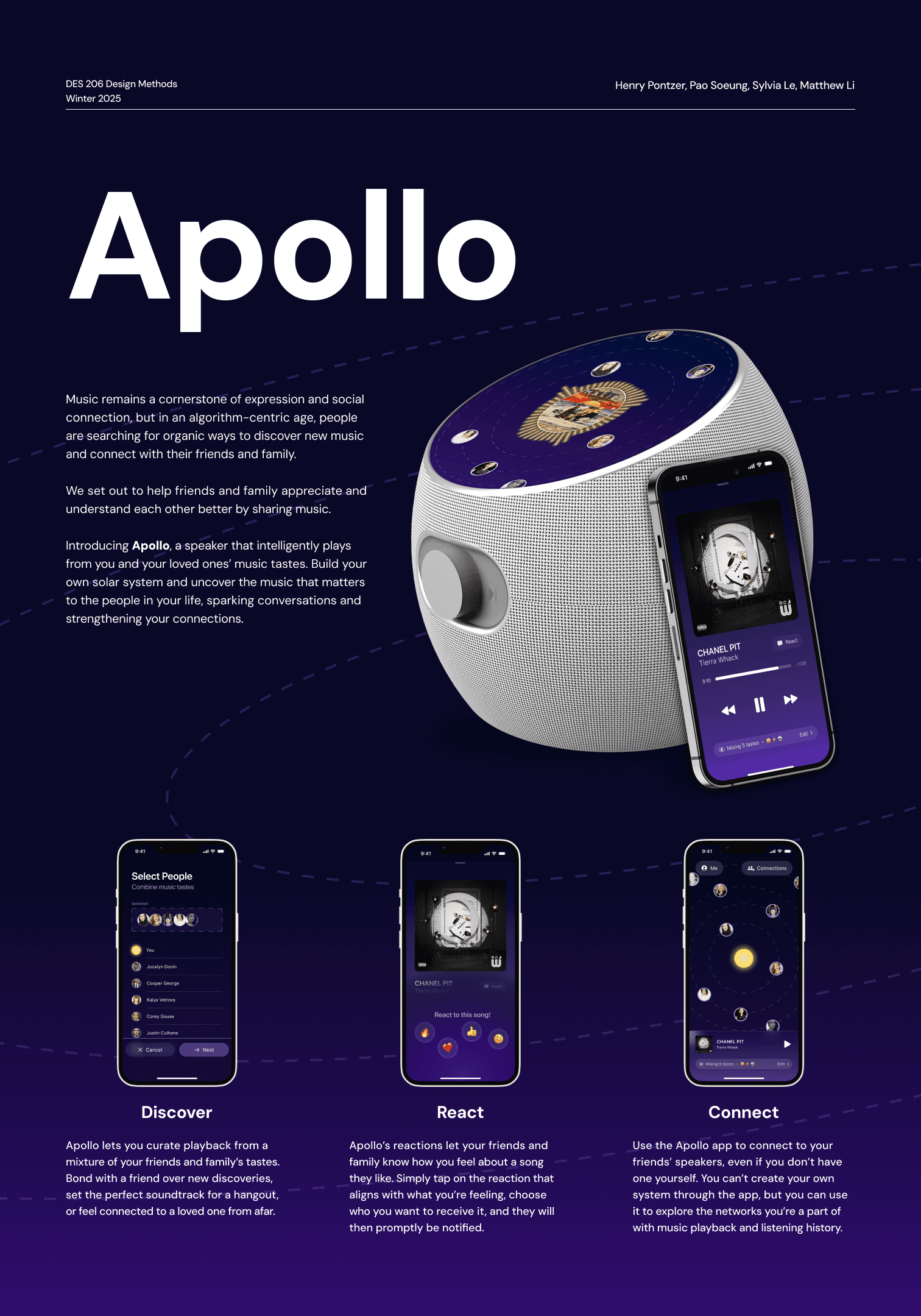 Our final deliverable consisted of a poster describing Apollo and a promotional video. On the poster are high-quality mock ups of the speaker, companion app, and key features.
