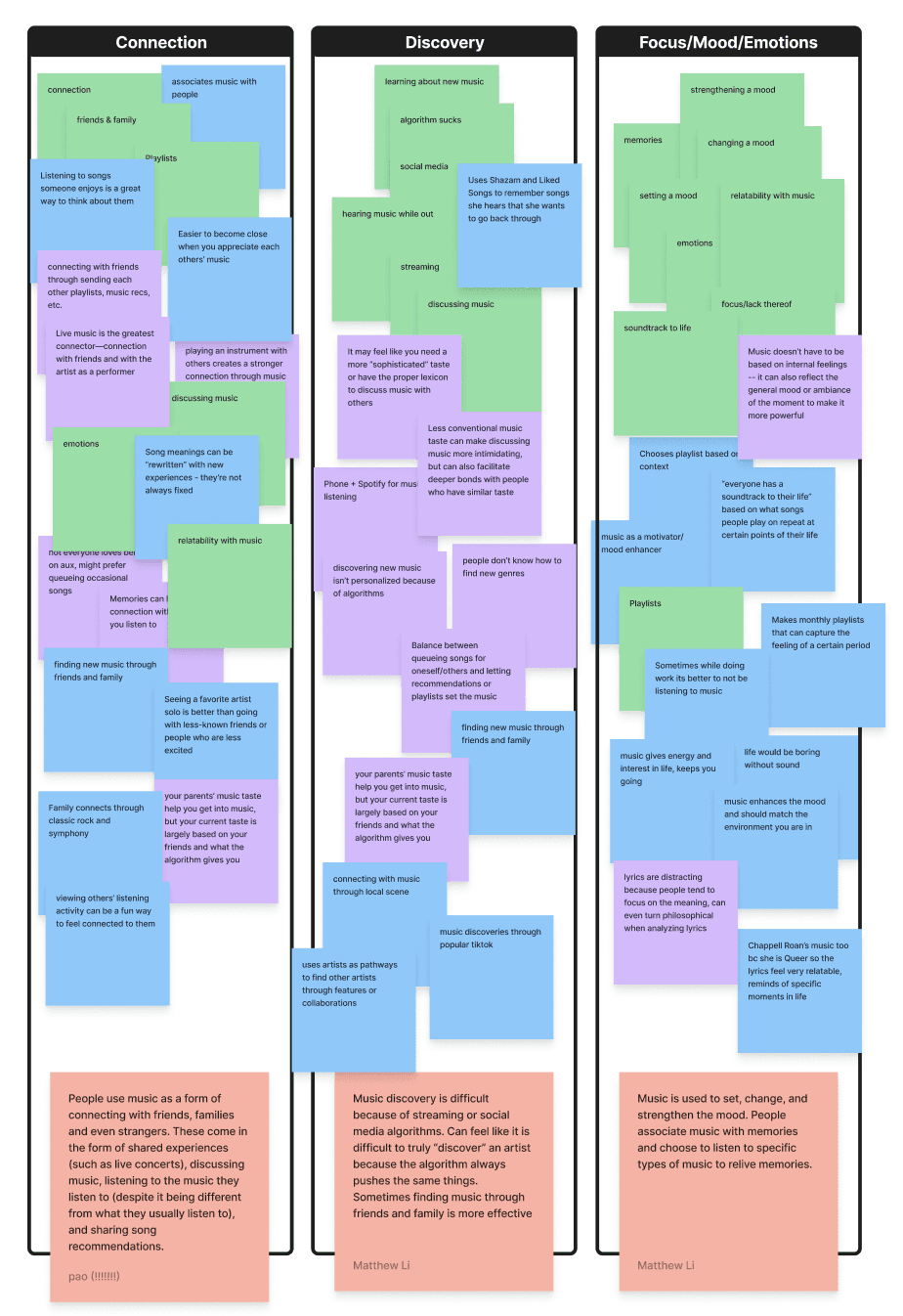 We began with a general questionnaire to gauge statistics revolving around music listening habits, and also used it to find potential participants to interview. Our survey received over 100 responses and of those, there were about 40 potential interviewees, which was narrowed down to 10.
